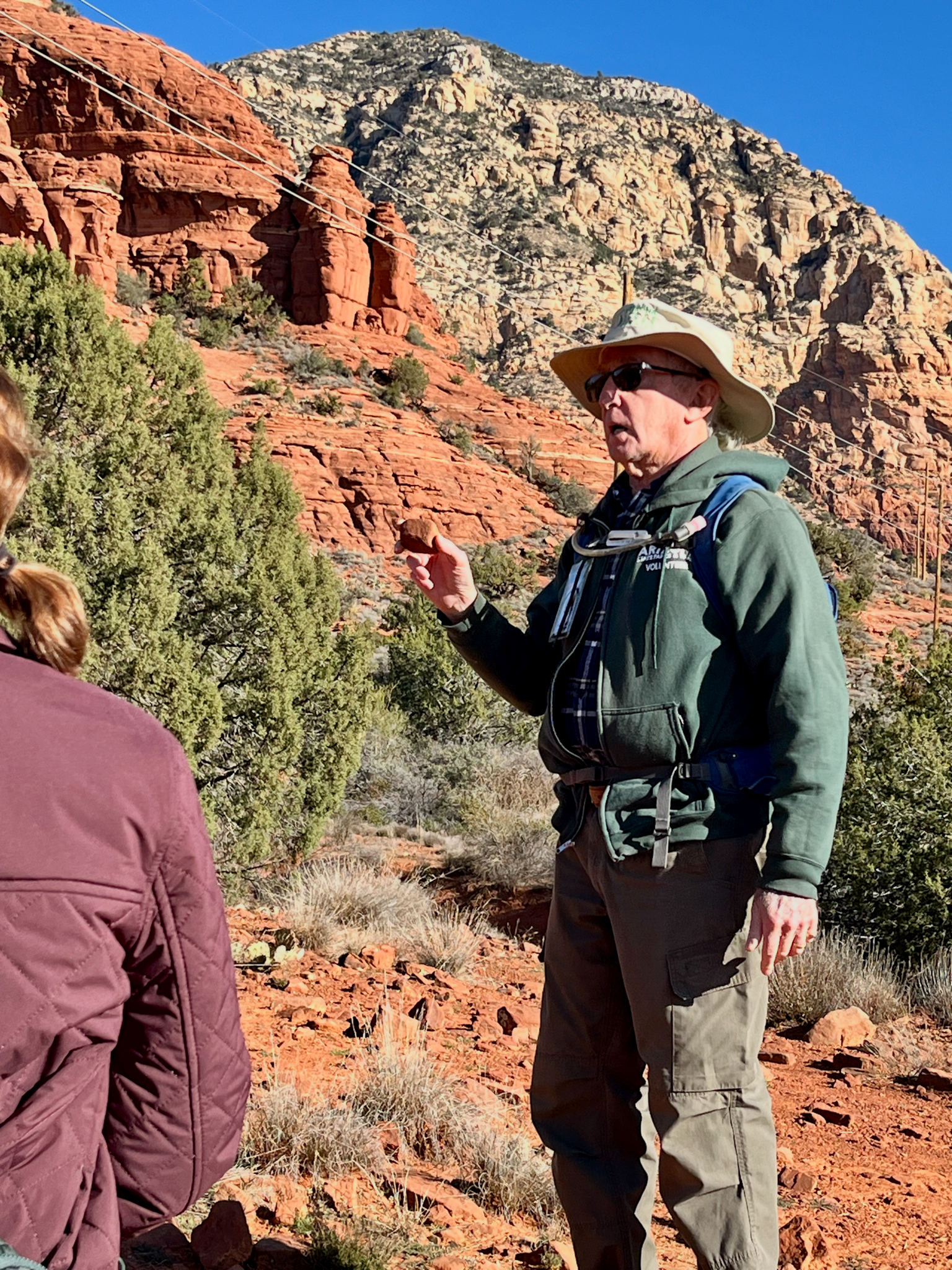Mallis, both a Friends of the Forest volunteer and a geology and archaeology/anthropology docent at Red Rock State Park, noted that learning about the geology right where one is hiking makes it likely one will never look at the landscape with the same eyes again. After he provided some initial overview information, there were nods of understanding as we scanned from Thunder Mountain, consisting mainly of light-gray-colored Coconino Sandstone, down to the abundant red rock around us.